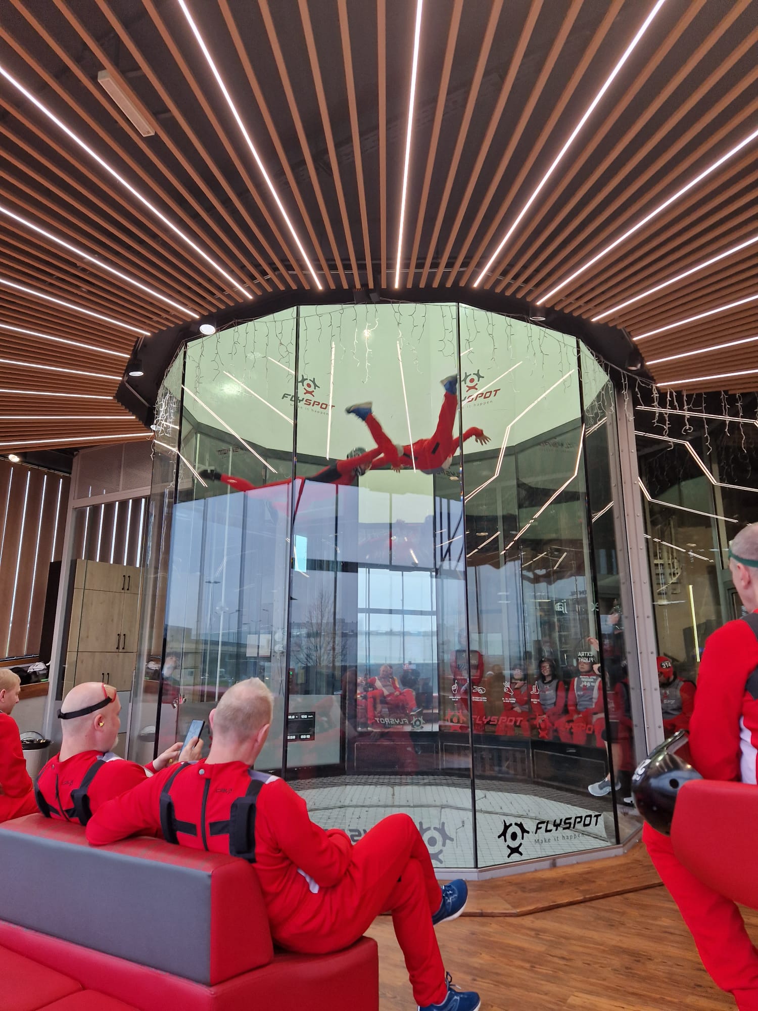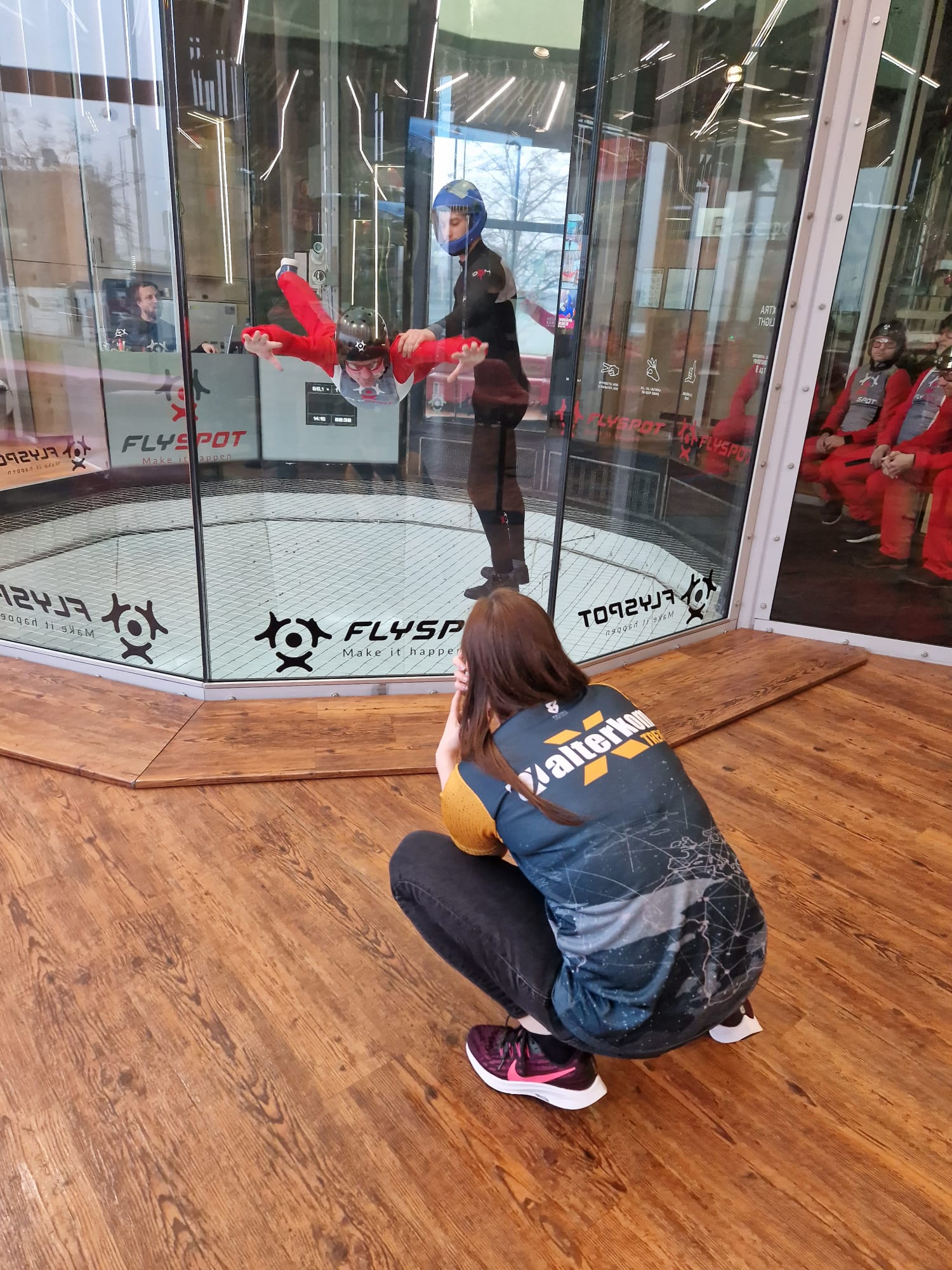 W drugiej części spotkania uczestnicy wzięli udział w krótkiej sesji szkoleniowej przed lotem, co przygotowało ich do wyjątkowej atrakcji dnia – doświadczając swobodnego lotu w jednym z najlepszych tuneli aerodynamicznych na świecie. Dzięki współpracy z Flyspot mogliśmy swobodnie unosić się w powietrzu i czuć bezpieczeństwo pod fachowym okiem instruktorów.